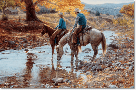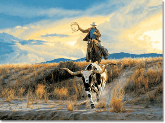 Tim Cox cowboy western artist is known for painting the realistic details that bring the cowboy to life; from the crease in the hat, the worn chaps, to spurs on his boots and every other aspect of the working cowboy. Along with the cowboy's horse, dog, cattle and the western landscape, nothing is left out.