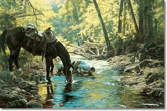 Tim Cox western artist is known for bringing paintings to life. His water paintings capture every ripple of the water, whether it is a flowing stream, lake or water trough surrounded by horses taking a refreshing drink, the detail is impeccable.